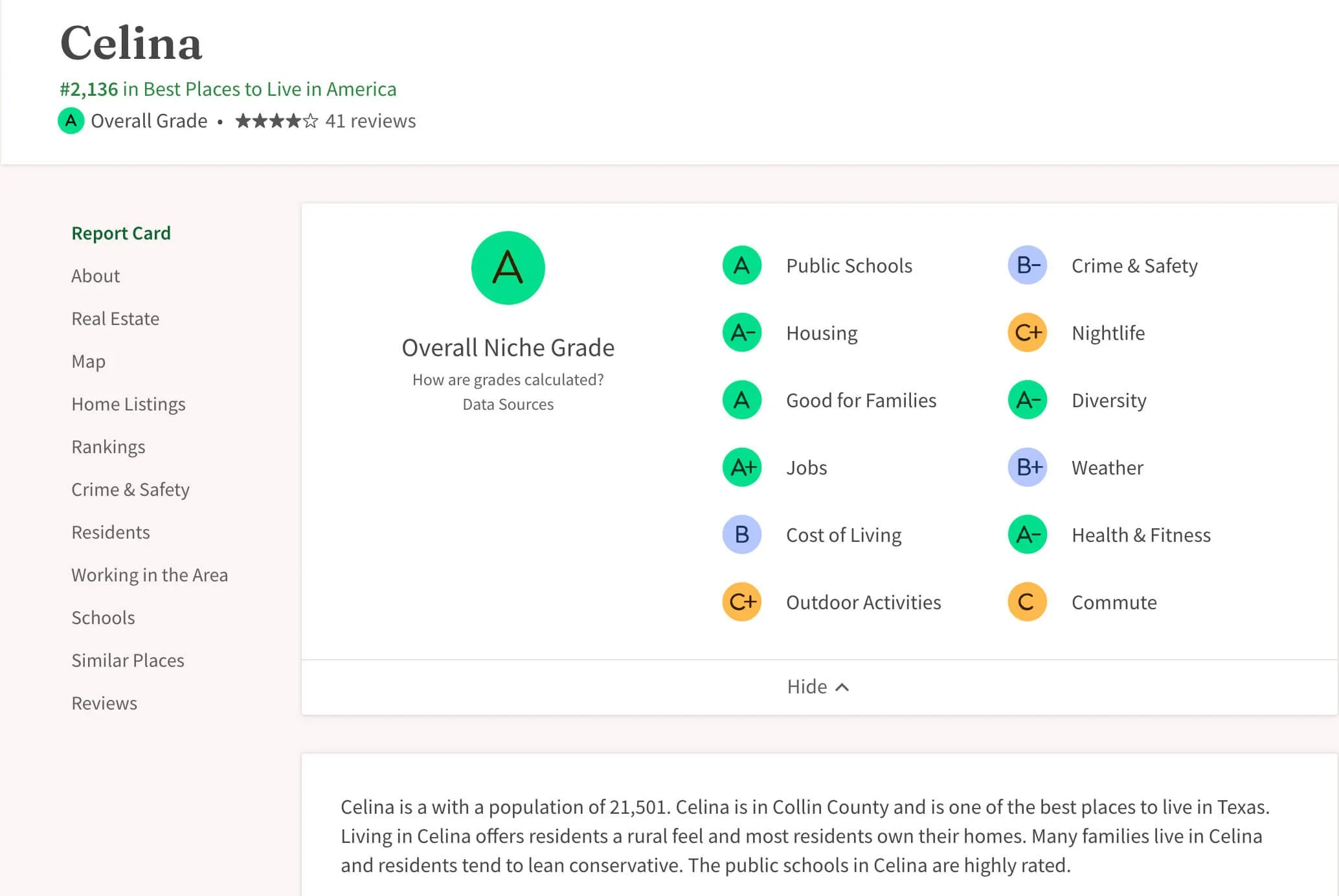 According to Niche.com, Celina, Texas, earns an overall A rating, reflecting strong scores in areas such as public schools (A) and housing (A-). Its family-oriented atmosphere and quality educational options stand out as key strengths, drawing many families and professionals to the area. However, some weaker spots—like limited nightlife and a lower diversity rating—may not appeal to those seeking a more cosmopolitan environment. Despite these drawbacks, Celina’s blend of small-town charm and proximity to the Dallas–Fort Worth metro area continues to make it an attractive place to live.