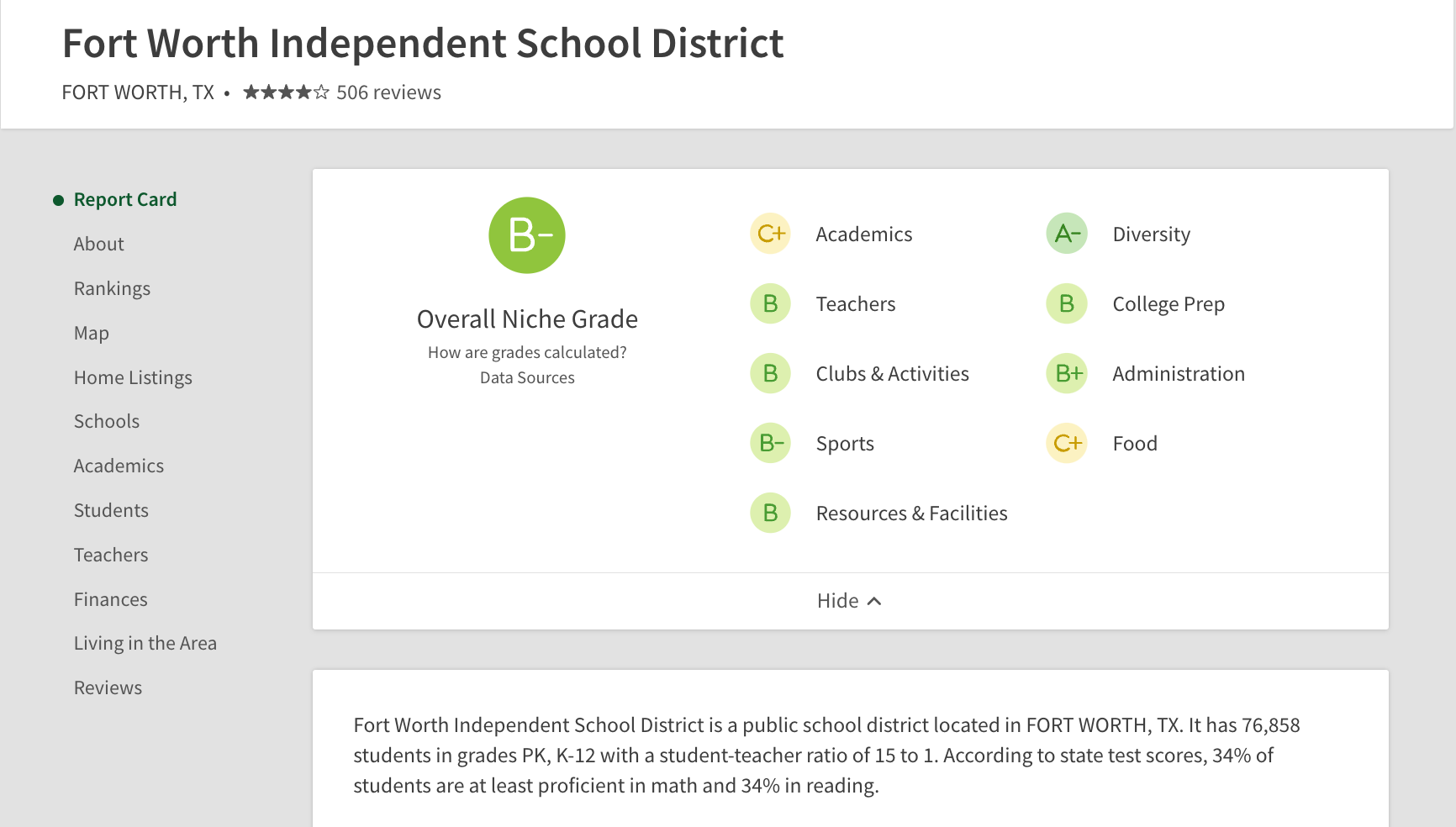 While Fort Worth has decent schools overall, with a B- rating on Niche, it may not have the top-rated schools that some families desire. The city's schools receive a C+ rating for academics, which may not meet parents' expectations of seeking the best education for their children. If schools are a top priority for your family, you may need to research and carefully consider the school options in Fort Worth before making a decision.