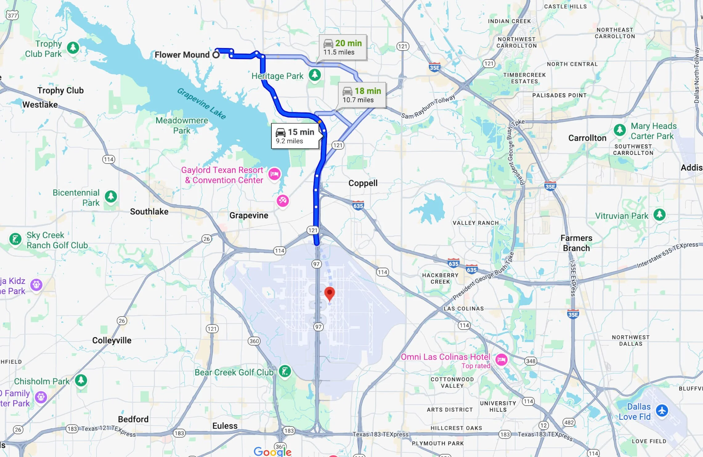 Typically Take 15 to 25 Minutes to get to the DFW Airport from Flower Mound