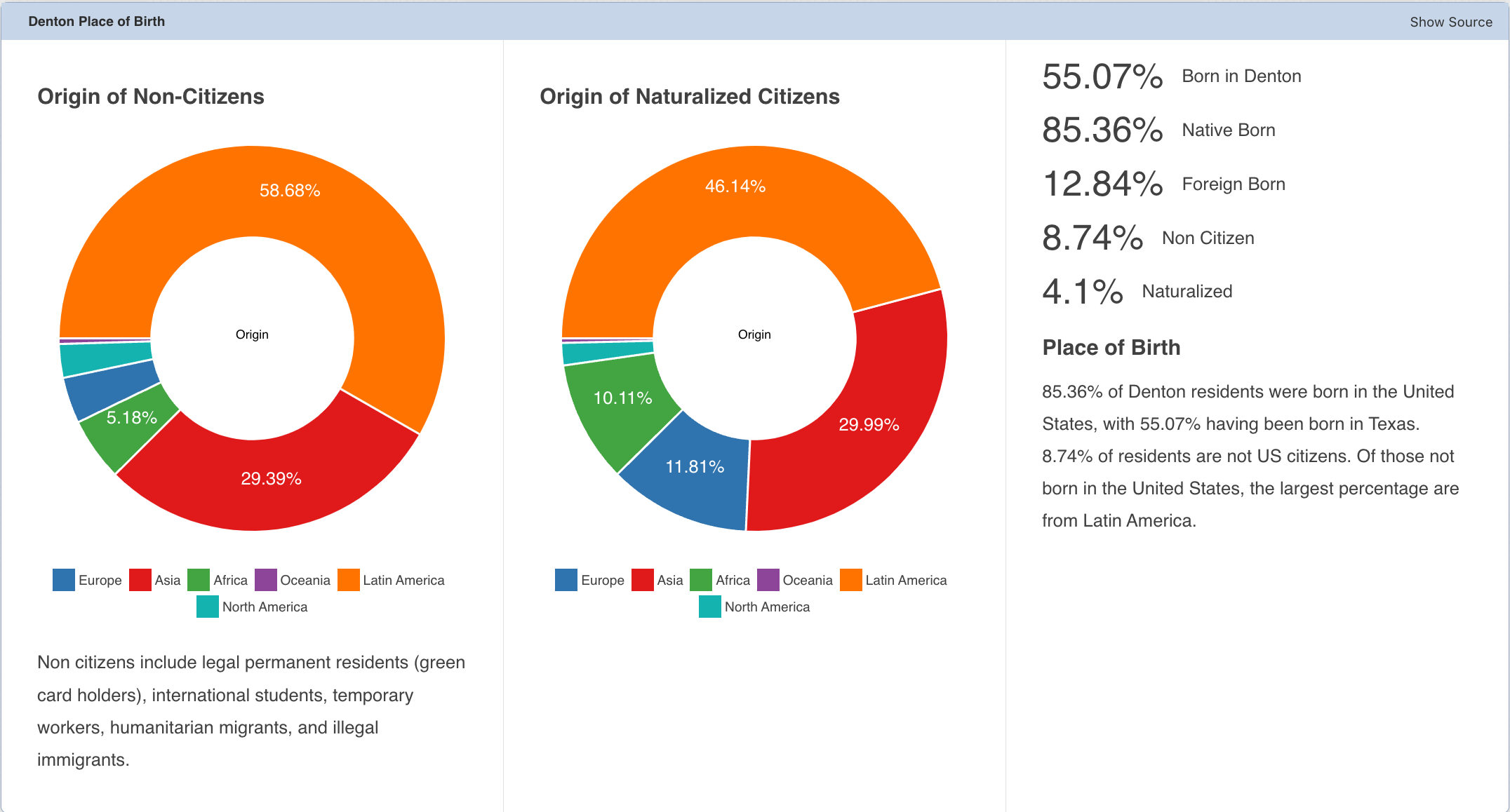 Denton, Texas is a city located in the north-central part of the state, with a population of approximately 160,500 people as of 2023. The city is the county seat of Denton County and is part of the Dallas-Fort Worth metropolitan area. Demographically, Denton has a diverse population, with a median age of 29.5 years, and a median household income of $62,542. The city's racial and ethnic makeup is approximately 60% White, 20% Hispanic or Latino, 12% Black or African American, and 4% Asian, with other races and ethnicities making up the remaining 4%. The predominant languages spoken are 77% English only, while 22.8% speak other languages, with Spanish accounting for 16.5% of that. In terms of Country of Origin, 85% of residents were born in the U.S., while 55% were born in Texas. In terms of foreign-born individuals, that account for about 8.7% of the residents.